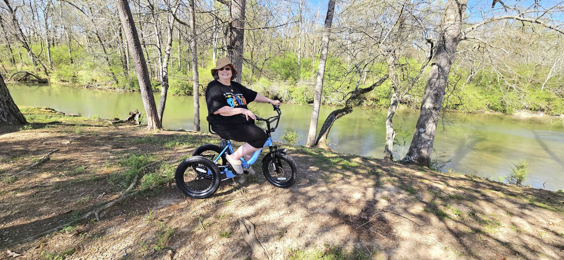 I bought an electric trike for riding around the campground. The directions to put it together were terrible, but YouTube helped. This is me below trying out my trike at my beautiful campsite.